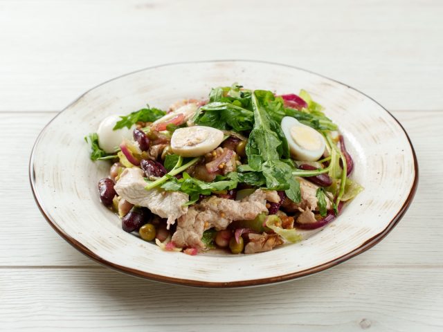 Салат с индейкой, овощами и перепелиным яйцом